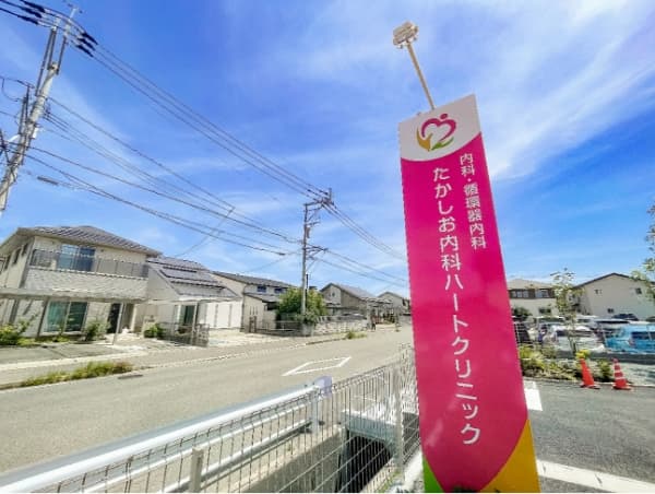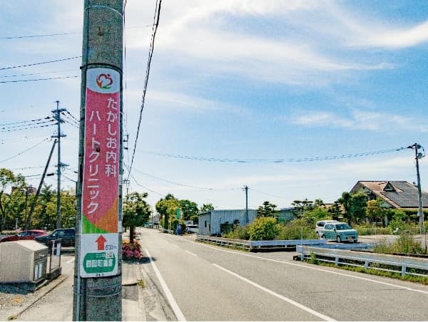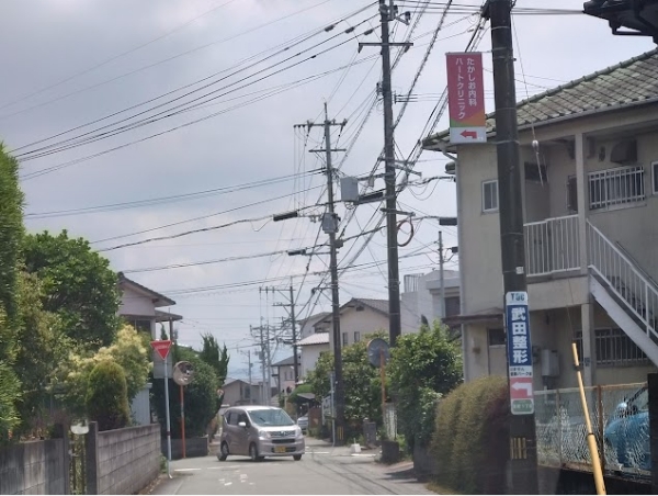 曲がった後は道なりに進み、右手電柱の袖看板を目印に左折してください。このあたりは道が狭いので、運転にはご注意ください。そのまま進むと右手にクリニックが見えてきます。