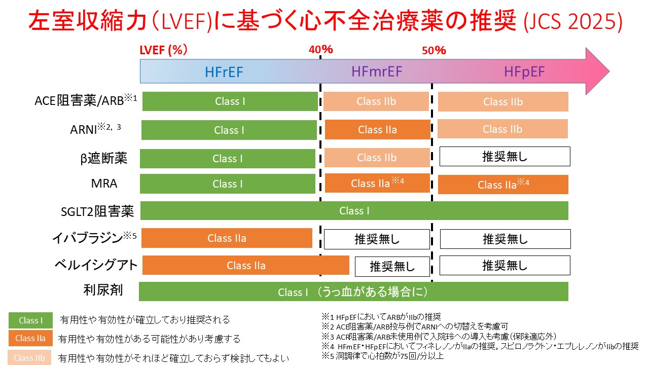 現在心不全の治療は左室駆出率という心臓の収縮力に応じた薬物治療を推奨しています。左室収縮力が低下した心不全(Heart failure with reduced ejection fraction: HFrEF)、左室収縮力が軽度低下した心不全(Heart failure with mildly reduced ejection fraction: HFmrEF)、左室収縮力が保持された心不全(Heart failure with preserved ejection fraction: HFpEF)の3つに大別されており、2025年に日本循環器学会が作成した心不全ガイドライン(2025年版)では以下のように推奨されています